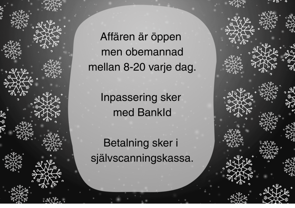 Butiken är öppen obemannat mellan Kl. 08:00 -20:00